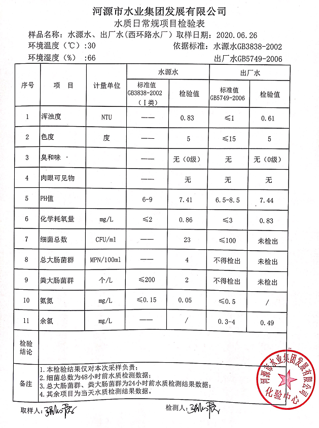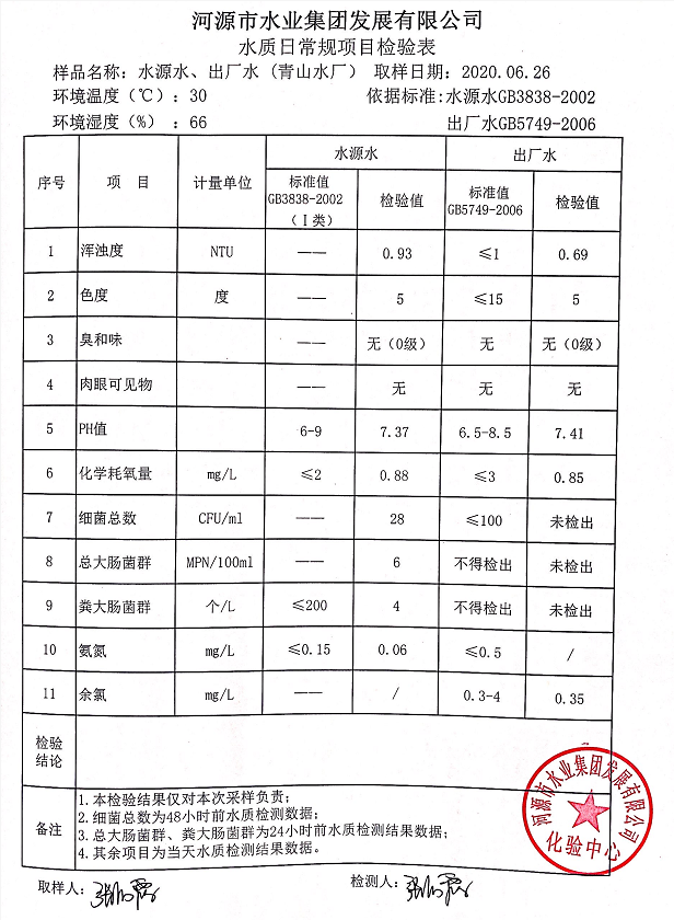 2020年6月26日水質(zhì)檢驗報告
