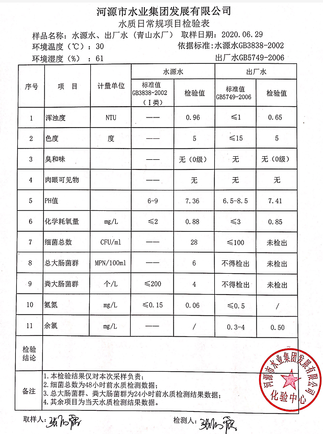 2020年6月29日水質(zhì)檢驗報告