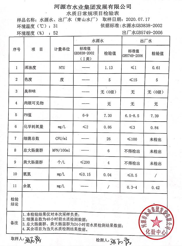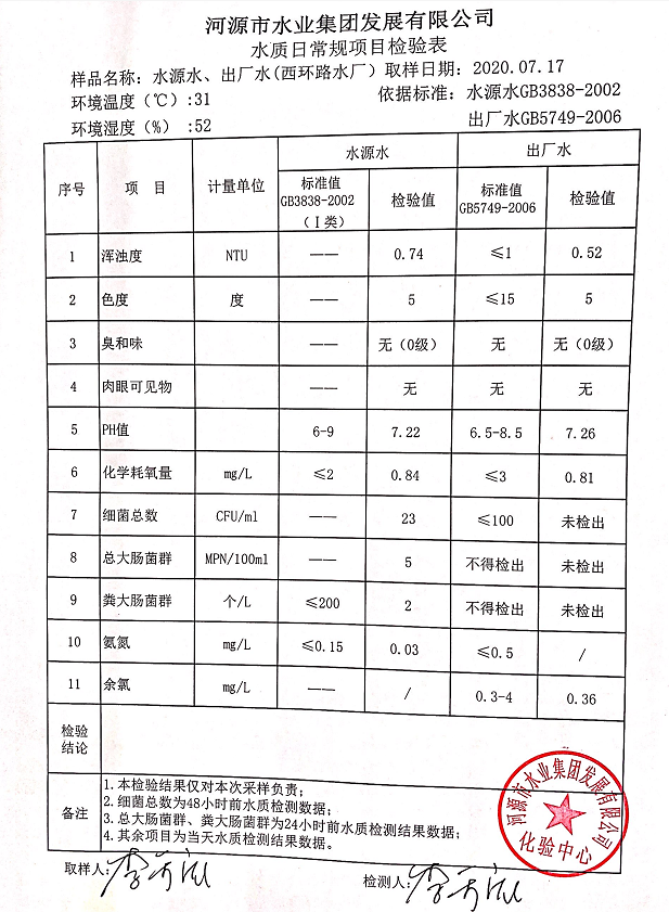 2020年7月17日水質(zhì)檢驗報告