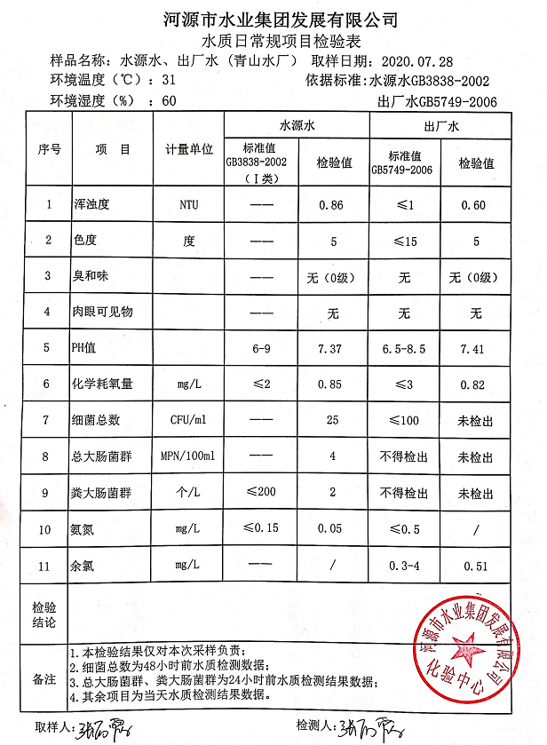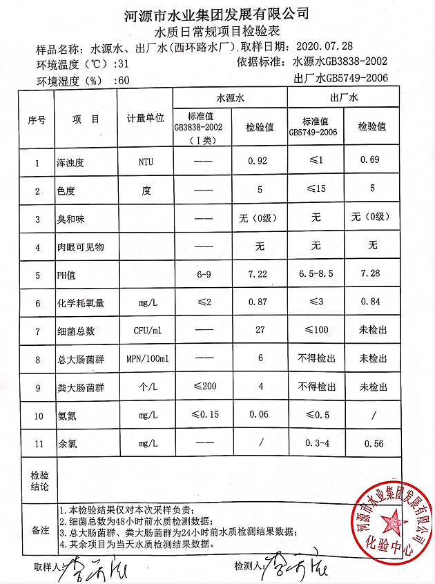 2020年7月28日水質(zhì)檢驗(yàn)報告
