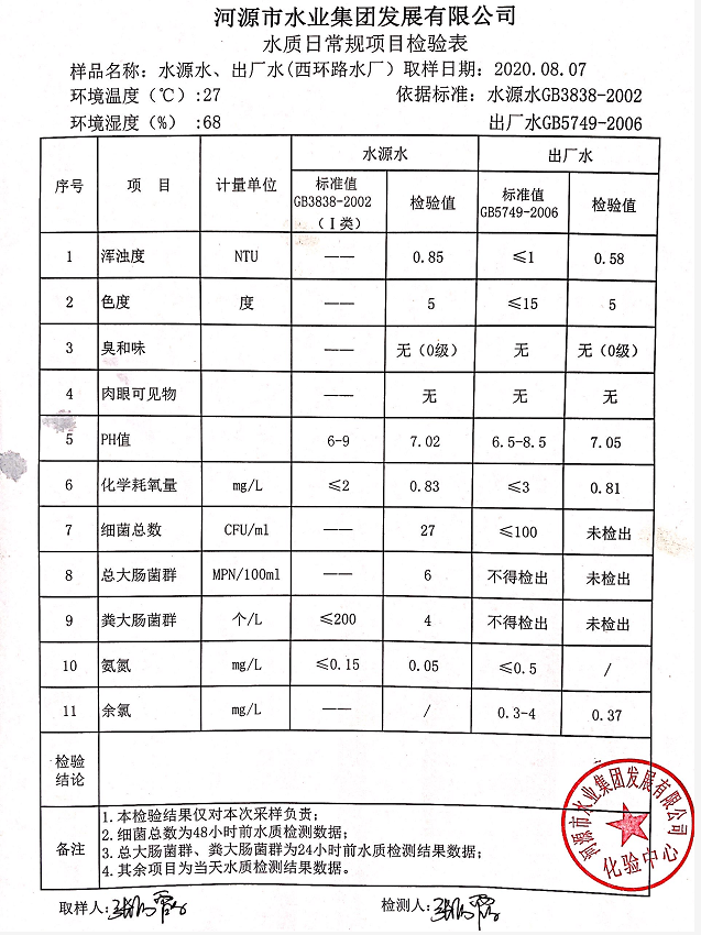 2020年8月7日水質(zhì)檢驗(yàn)報(bào)告