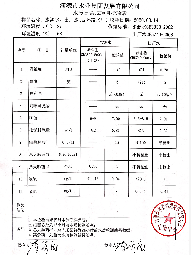 2020年8月14日水質(zhì)檢驗(yàn)報(bào)告