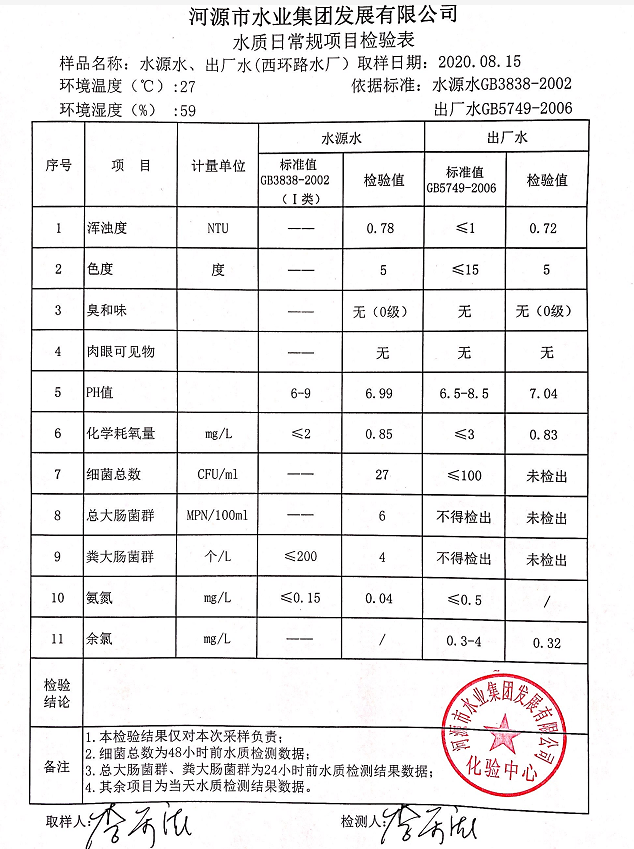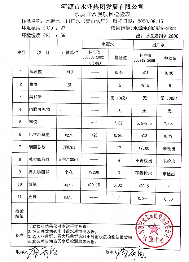 2020年8月15日水質(zhì)檢驗(yàn)報(bào)告