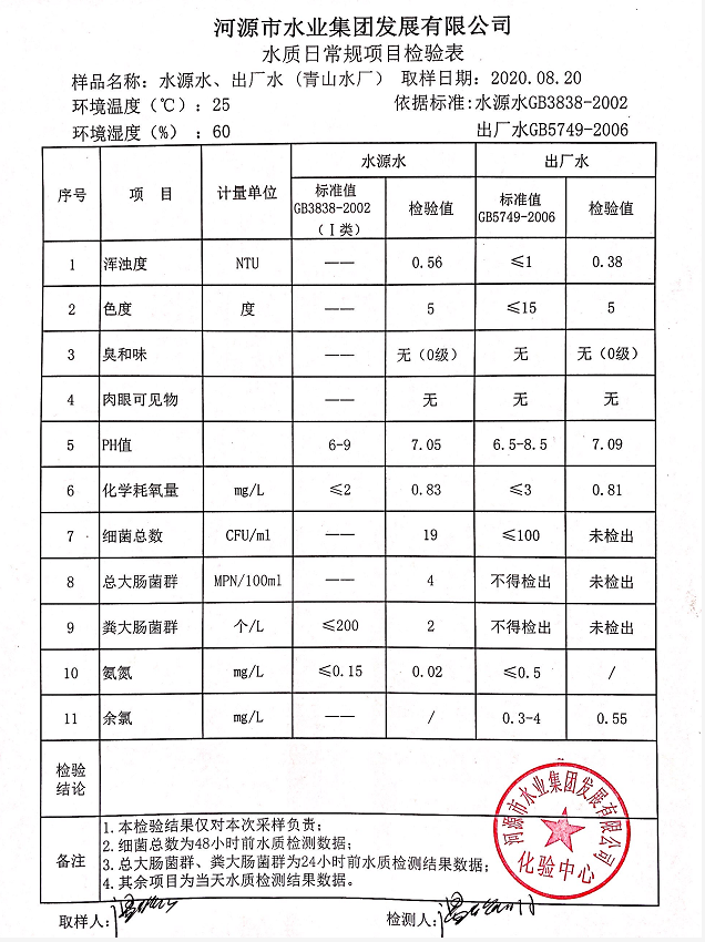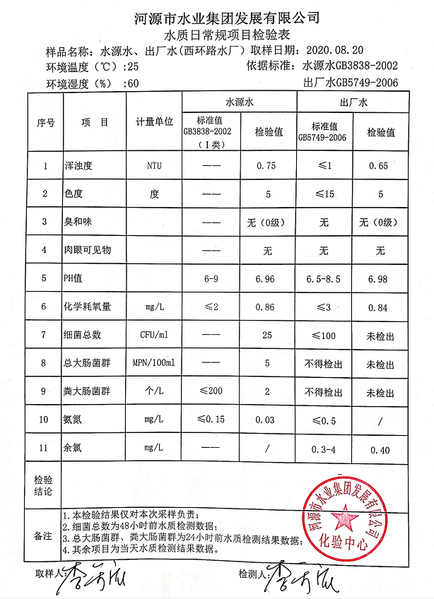 2020年8月20日水質(zhì)檢驗報告