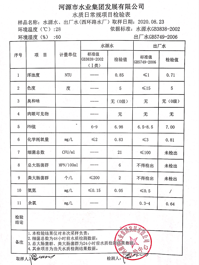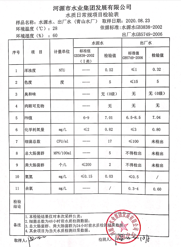 2020年8月23日水質(zhì)檢驗(yàn)報(bào)告