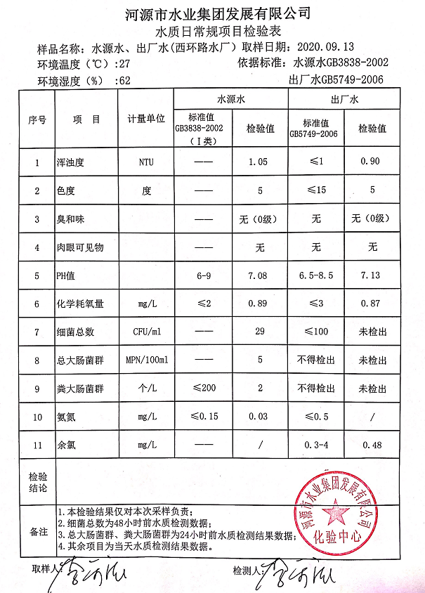 2020年9月13日水質(zhì)檢驗報告