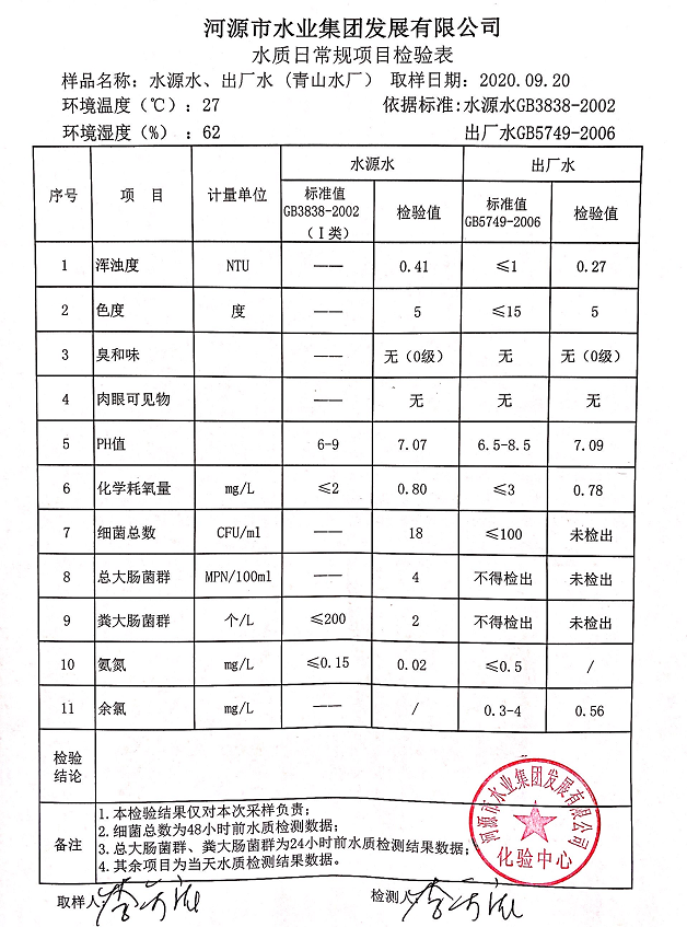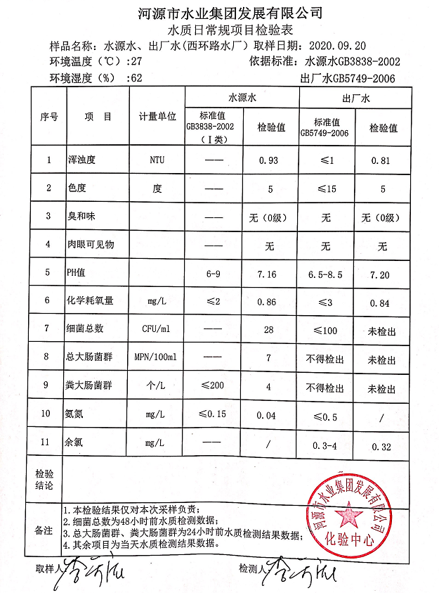2020年9月20日水質(zhì)檢驗報告