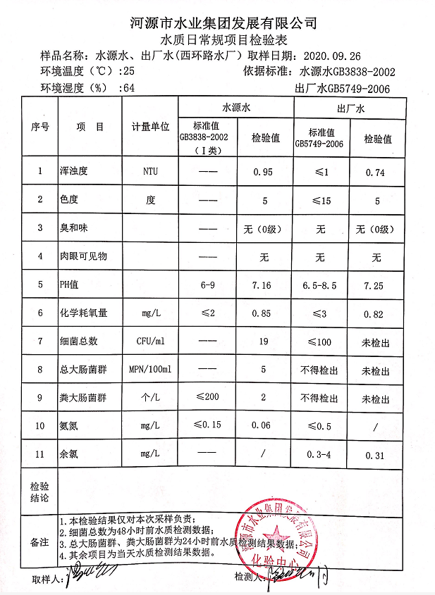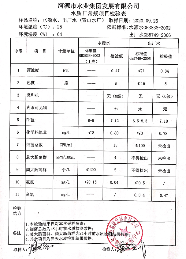 2020年9月26日水質(zhì)檢驗(yàn)報(bào)告