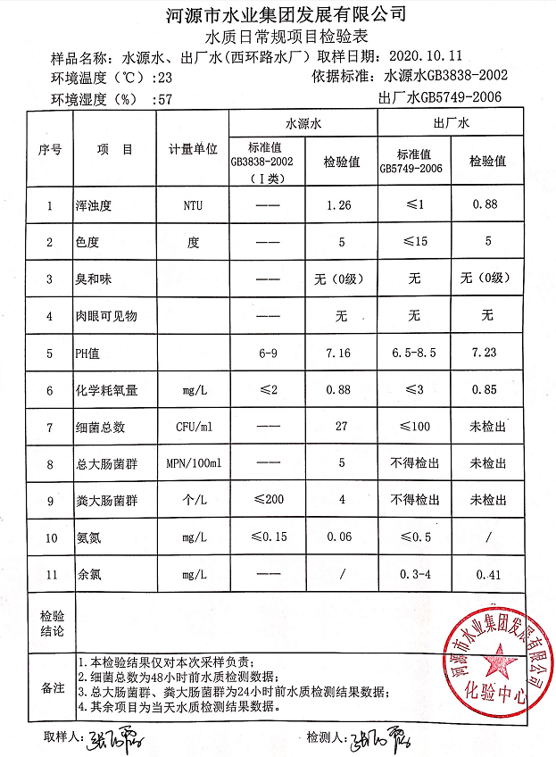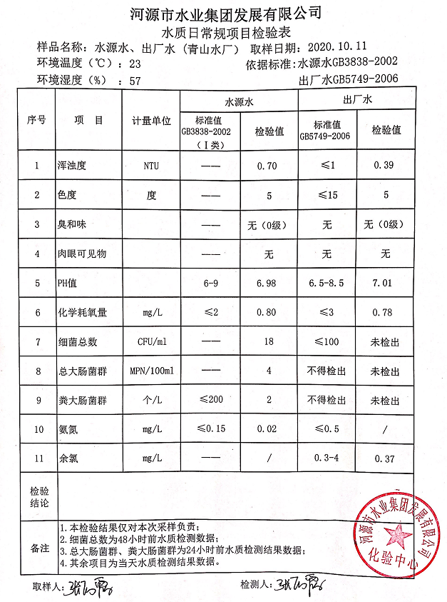 2020年10月11日水質檢驗報告