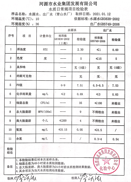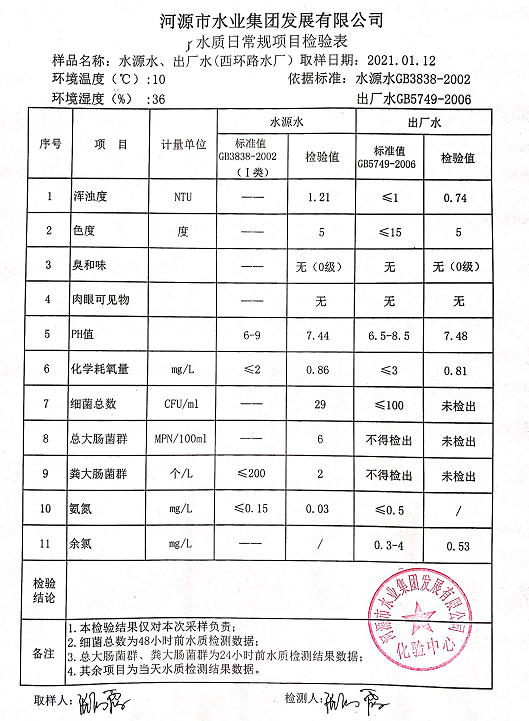 2021年1月12日水質(zhì)檢驗報告