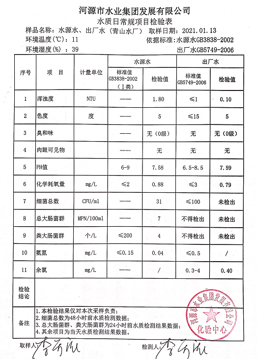 2021年1月13日水質(zhì)檢驗(yàn)報(bào)告