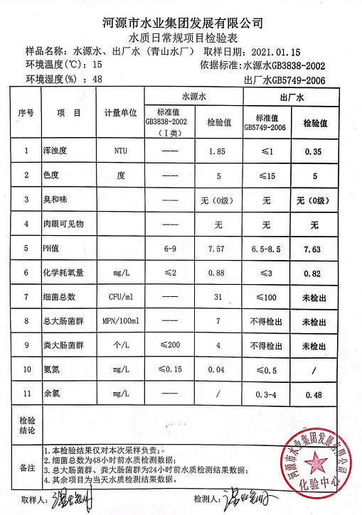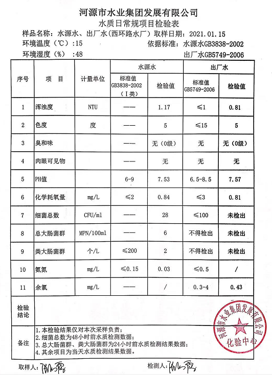 2021年1月15日水質(zhì)檢驗(yàn)報(bào)告
