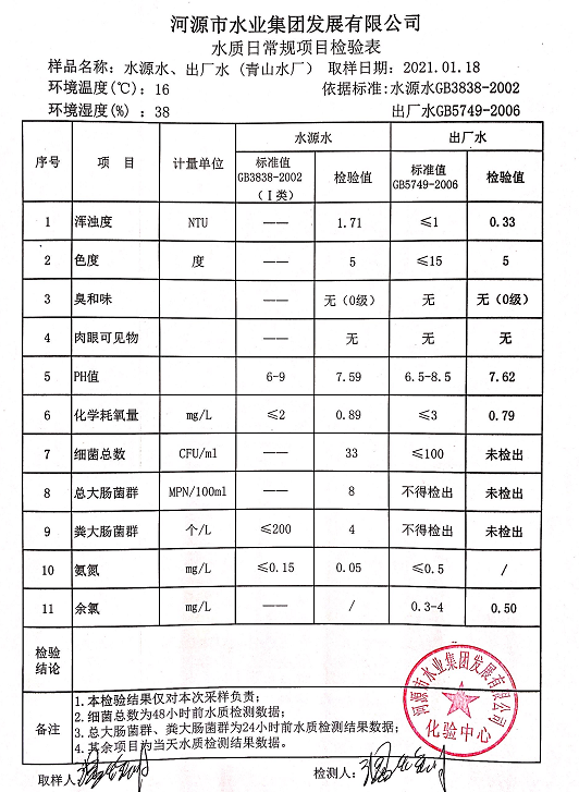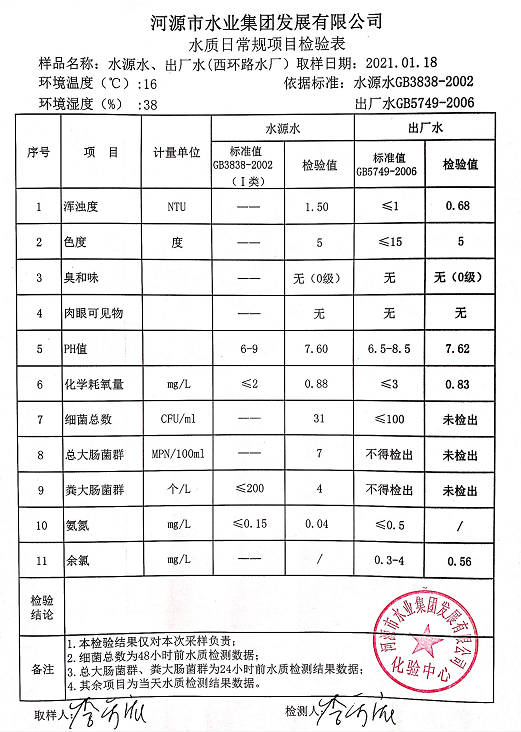 2021年1月18日水質(zhì)檢驗報告