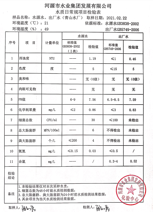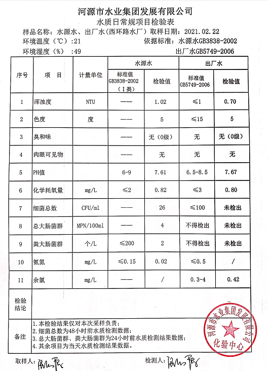 2021年2月22日水質(zhì)檢驗(yàn)報告