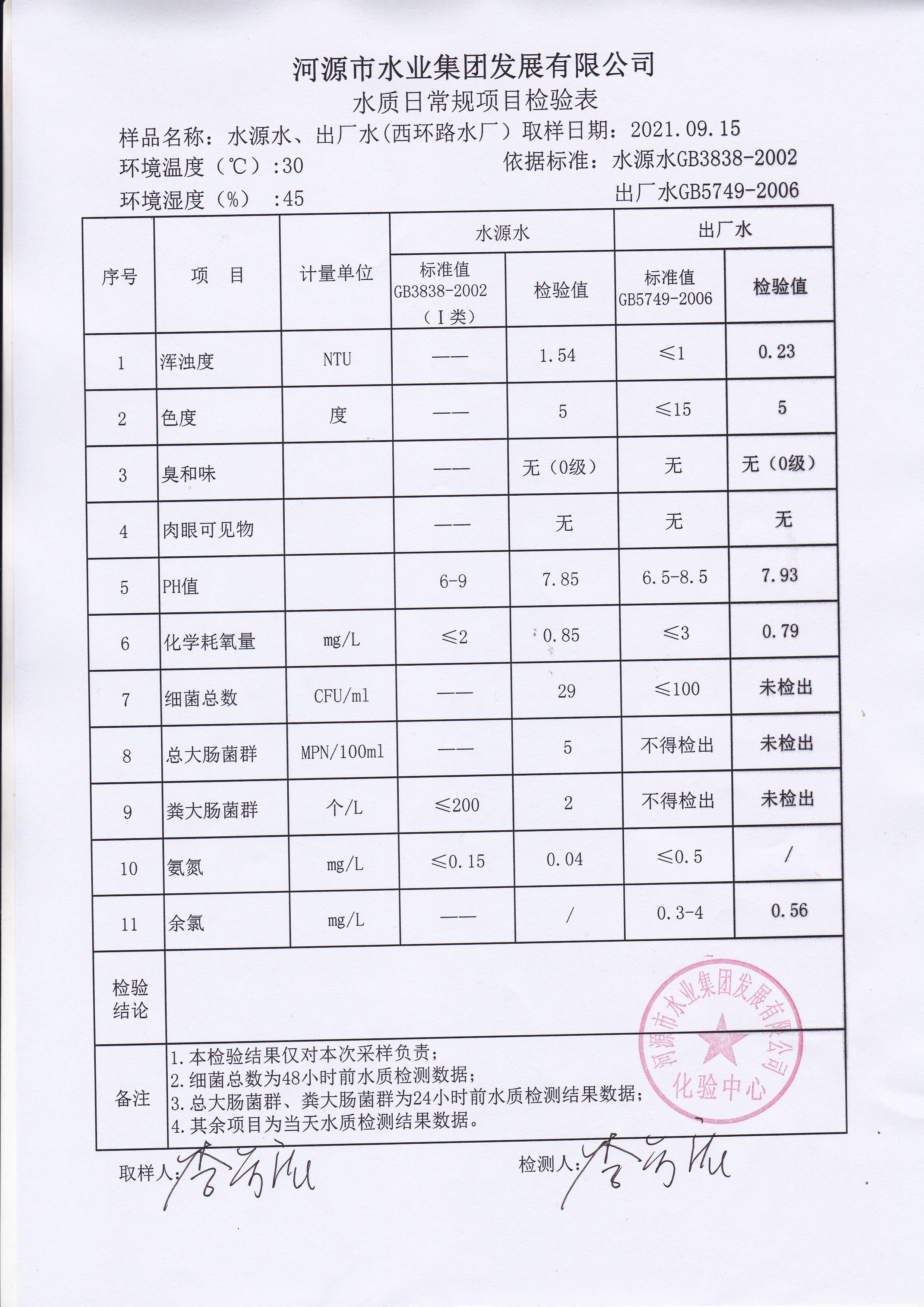 2021年9月15日水質(zhì)檢驗(yàn)報(bào)告 ??