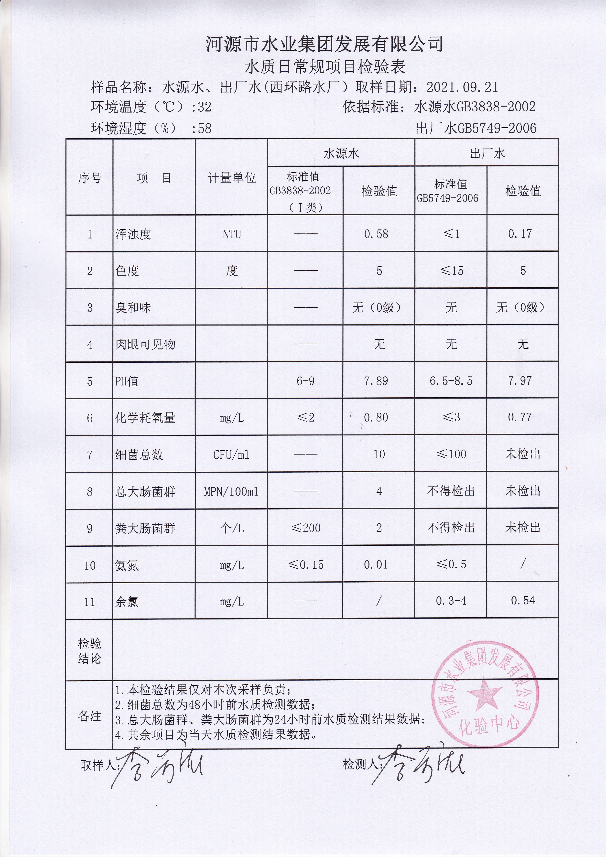 2021年9月21日水質(zhì)檢驗報告