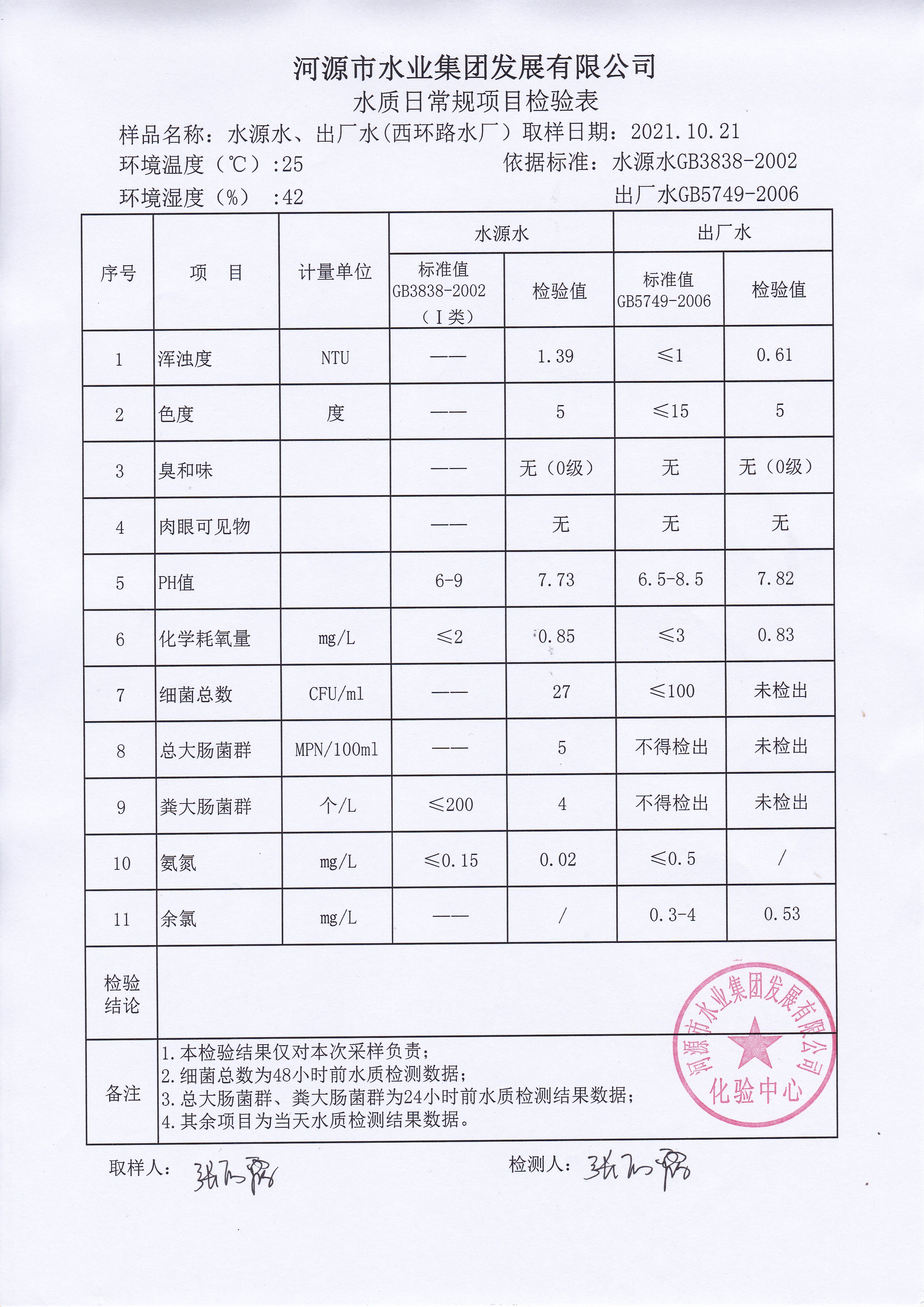 2021年10月21日水質(zhì)檢驗報告