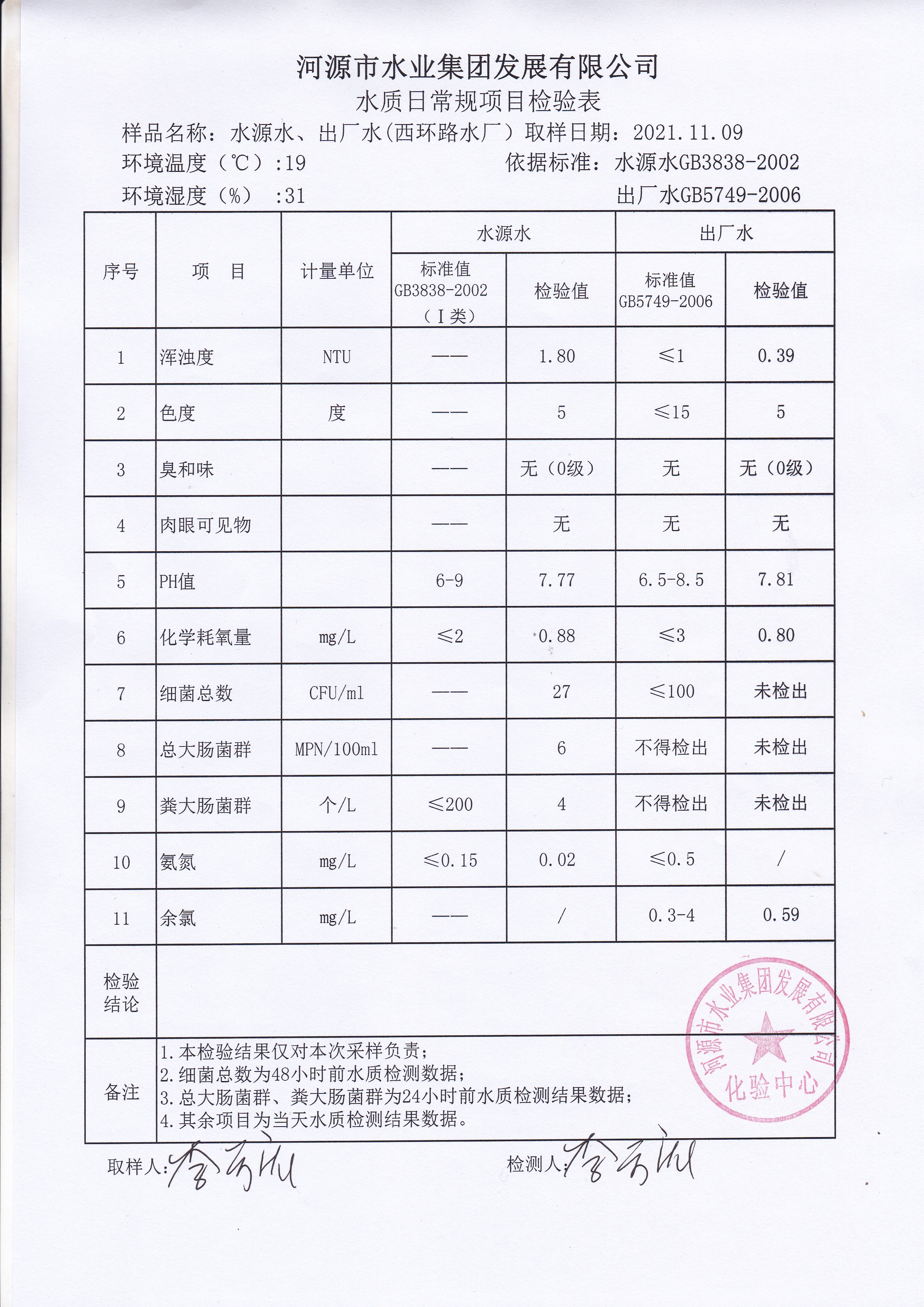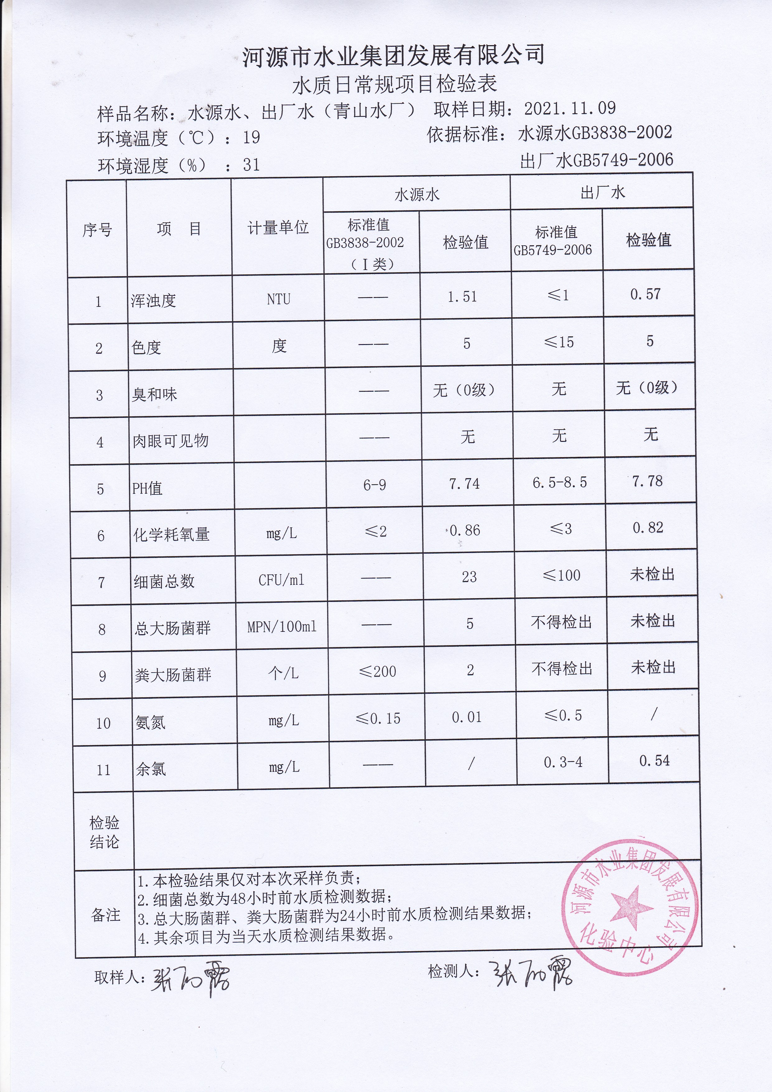 2021年11月9日水質(zhì)檢驗報告