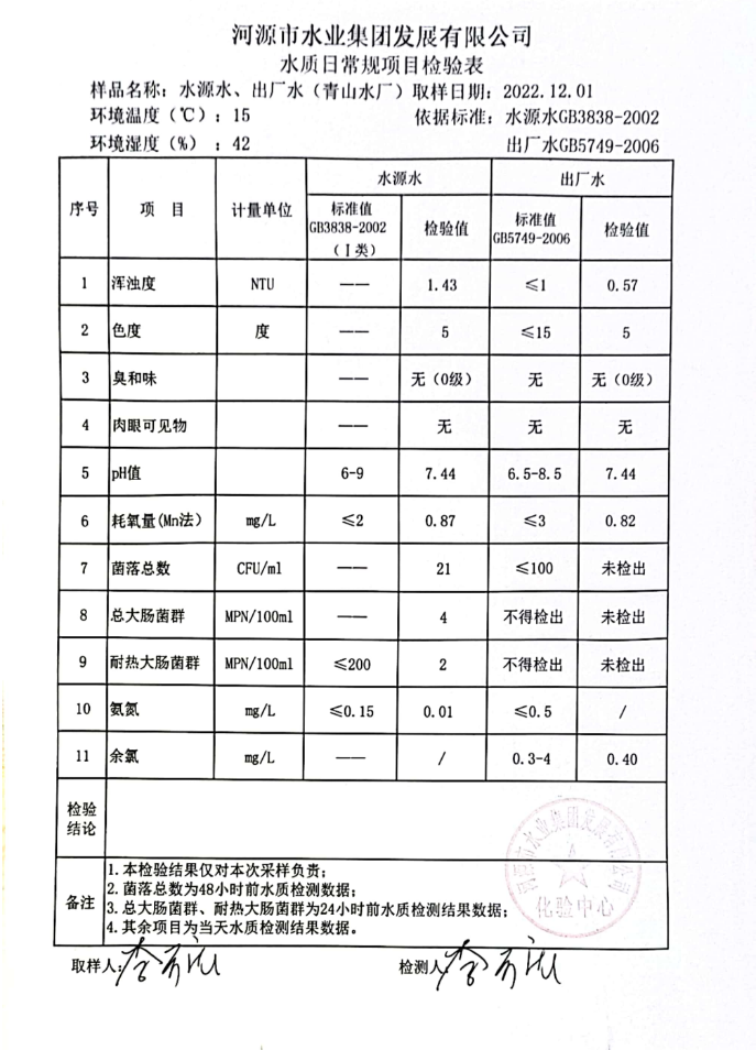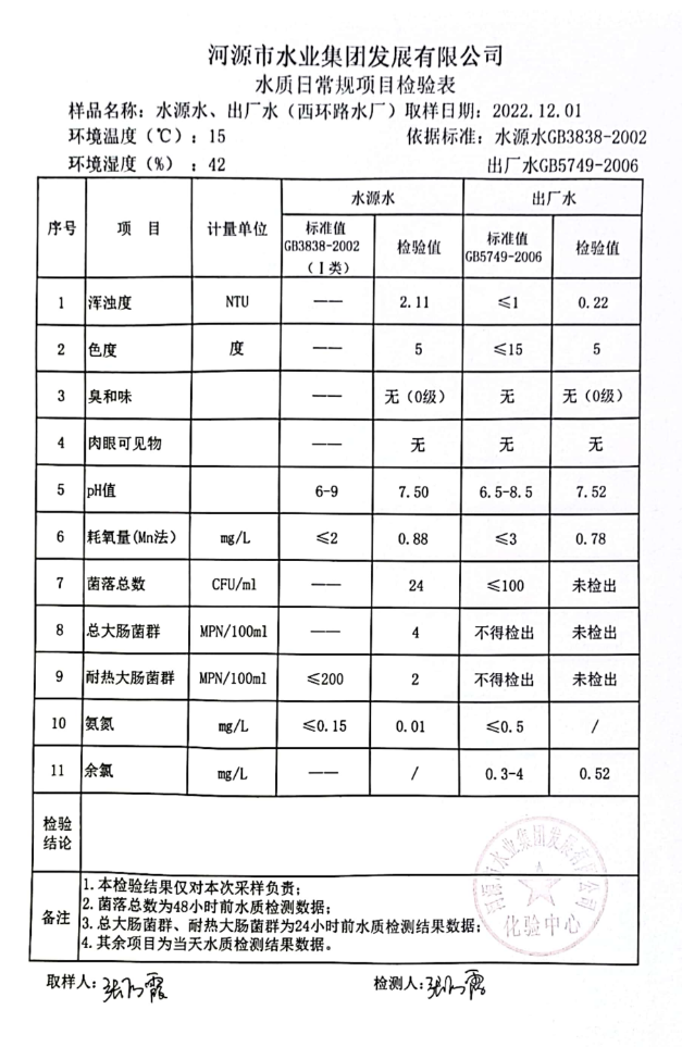 2022年12月1日水質(zhì)檢驗(yàn)報(bào)告