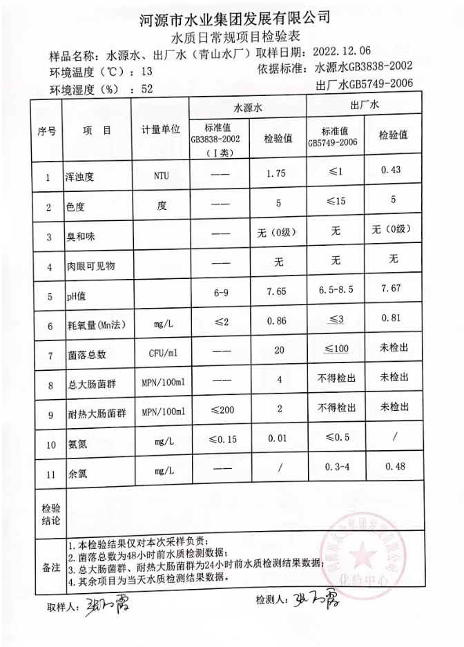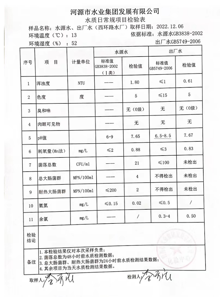 2022年12月6日水質(zhì)檢驗報告