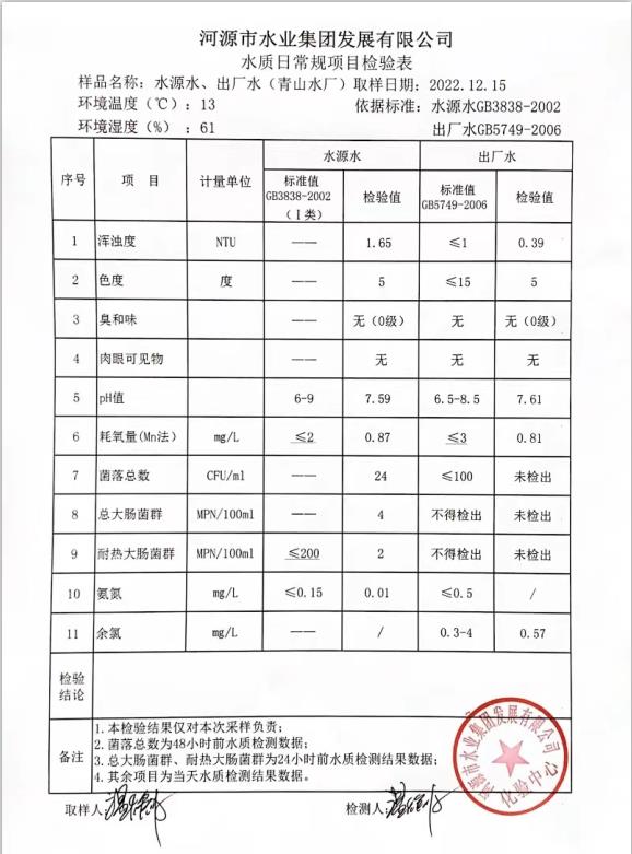 2022年12月16日水質(zhì)檢驗報告