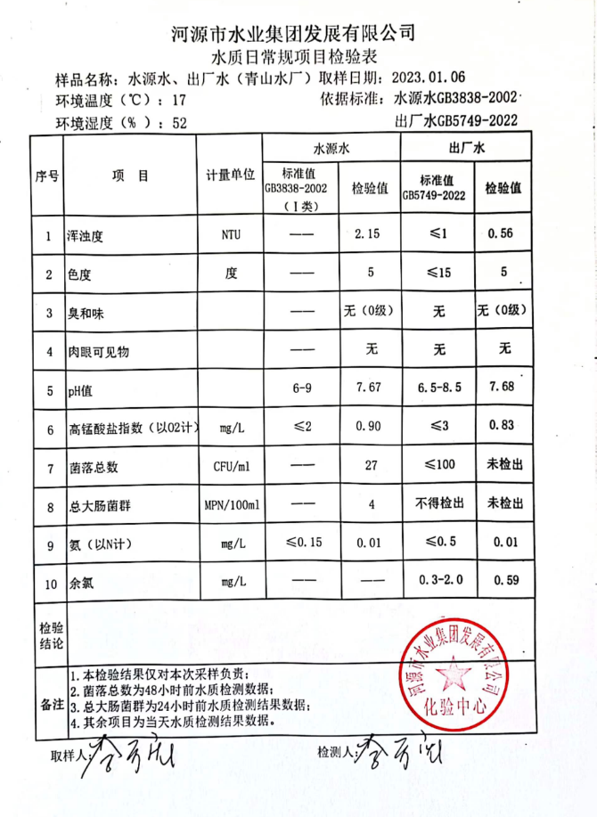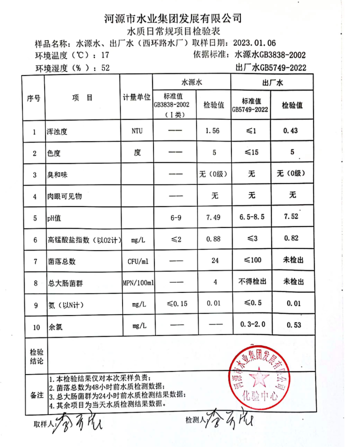 2023年1月6日水質(zhì)檢驗(yàn)報(bào)告