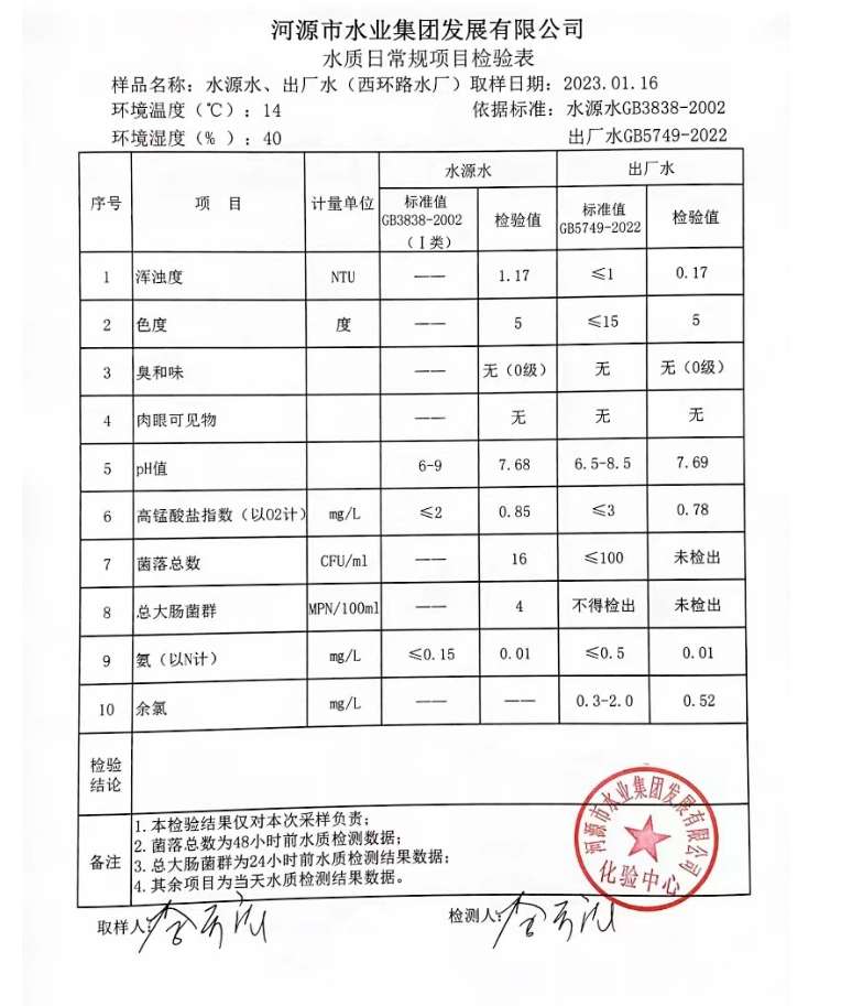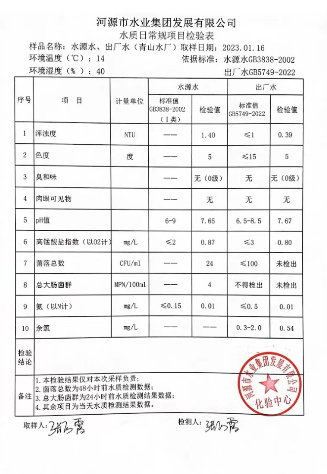 2023年1月16日水質(zhì)檢驗報告
