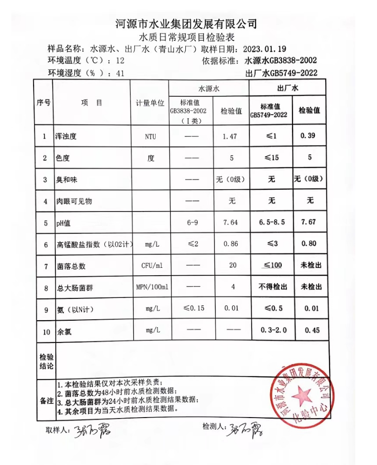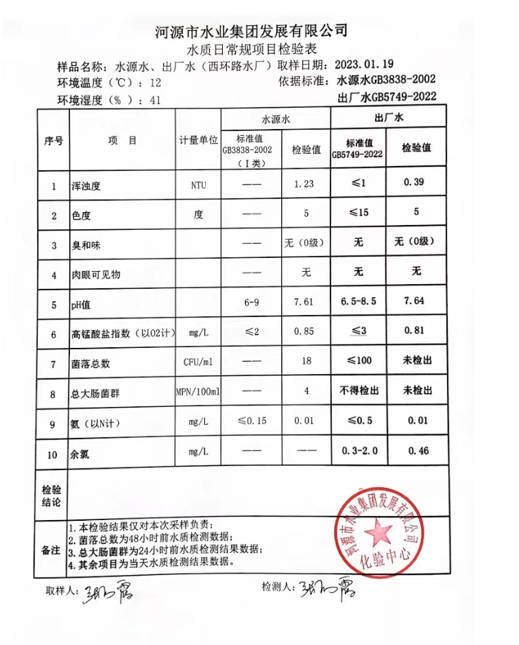 2023年1月19日水質(zhì)檢驗報告