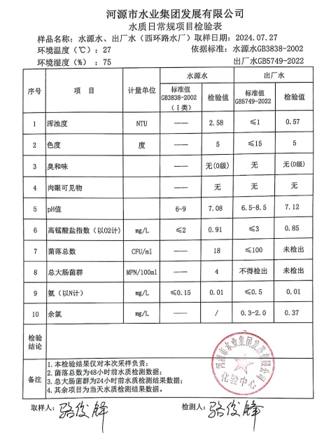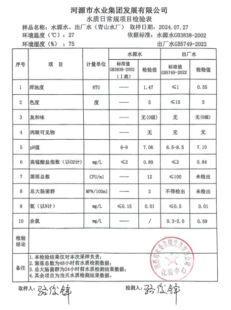 2024年7月27日水質(zhì)檢驗(yàn)報(bào)告