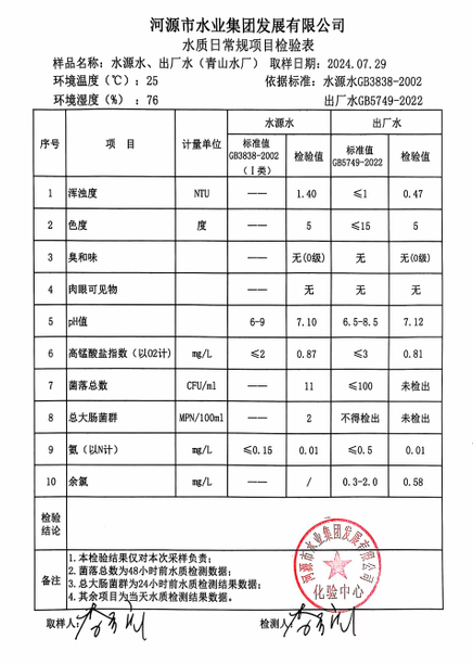 2024年7月29日水質(zhì)檢驗(yàn)報(bào)告