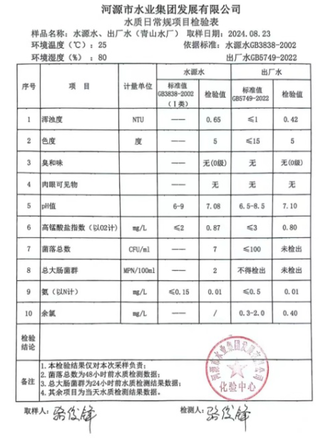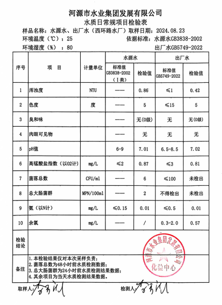 2024年8月23日水質(zhì)檢驗(yàn)報告